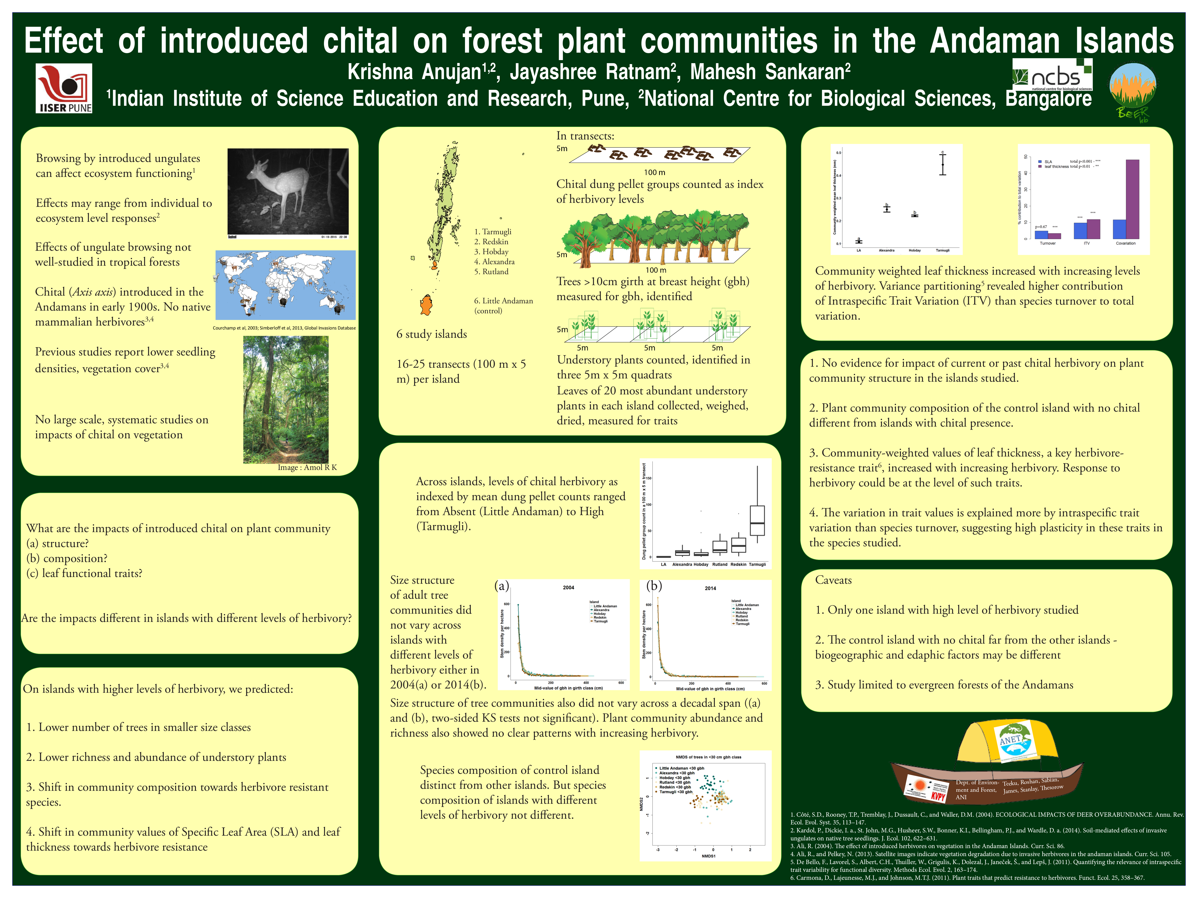 Anujan K, Ratnam J and Sankaran M, 2015. Effect of introduced chital on forest plant communities in the Andaman Islands. Student Conference for Conservation Sciences, Bangalore, 2015. Best Poster Award