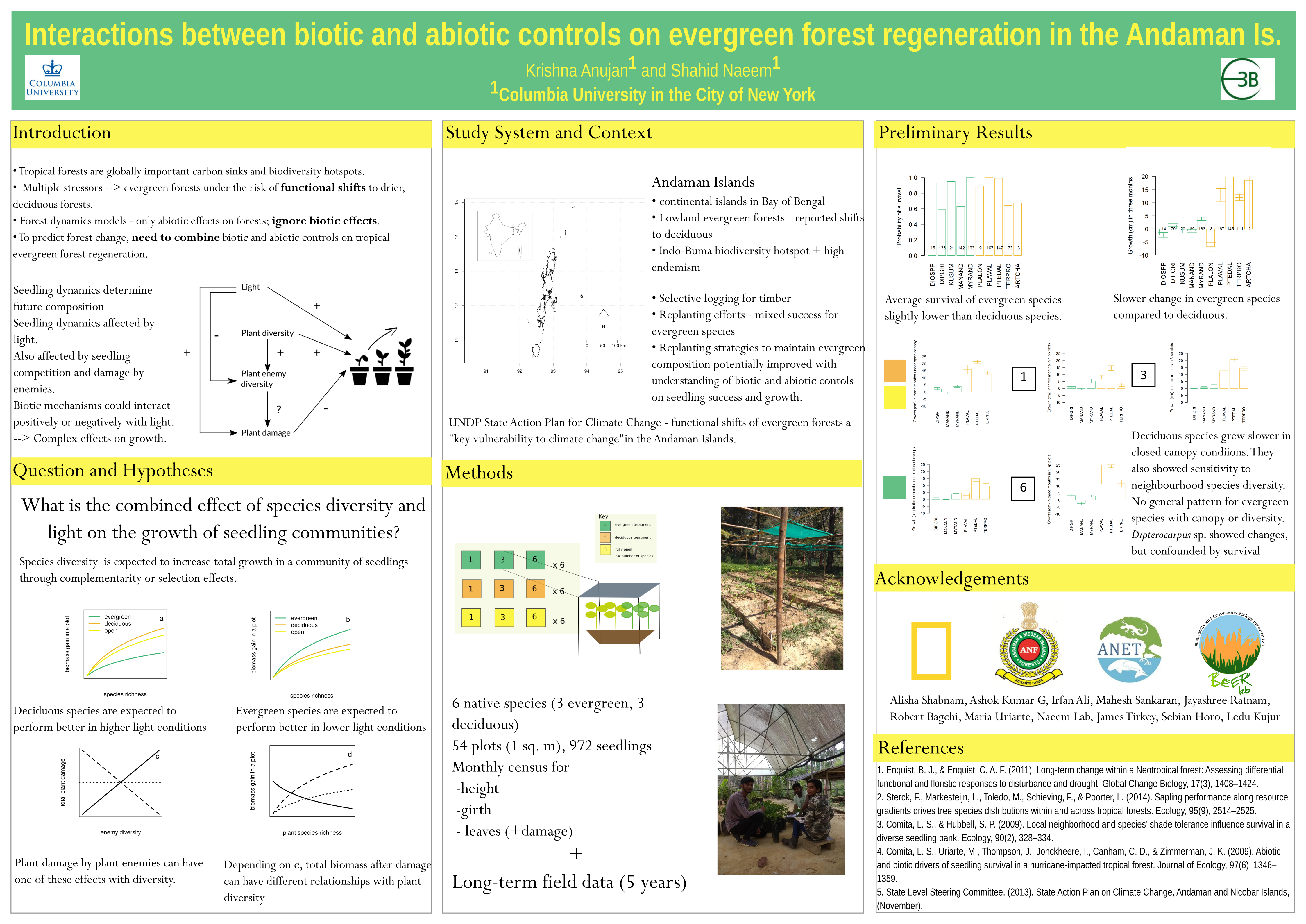 Anujan K and Naeem S, Interactions between biotic and abiotic controls on evergreen forest regeneration in the Andaman Islands. Annual Meeting of the Association of Tropical Biology and Conservation, Antananarivo, Madagascar, 2019